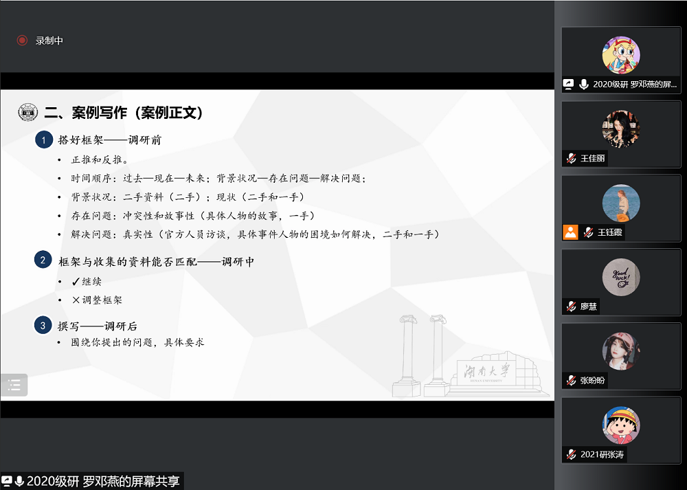 2020级硕士研究生孙幼龄首先对选题进行了补充,之后结合清华大学官网的案例分析报告的写作要求为同学们具体讲解应该怎样进行案例写作和分析,强调要保证真实性、典型性和冲突性;同时案例逻辑需严密清晰,案例语句需真实生动,案例格式需严谨认真。