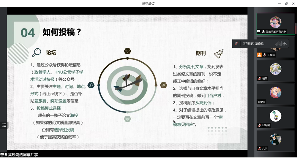 梁晓鸣首先分享了如何选题,她提出可以从导师的课题、研究方向、课堂分享和对现有文献的梳理四个方面获得灵感;之后梁晓鸣结合自身的科研写作经历与同学们分享如何自学技术和找数据,她认为可以通过互联网获取很多资源,如通过B站的优质视频教程学习Stata和R语言以及通过公众号免费获取数据等等;最后梁晓鸣分享了如何投稿,其中包括论坛和期刊的投稿建议,给了同学们很多启发。