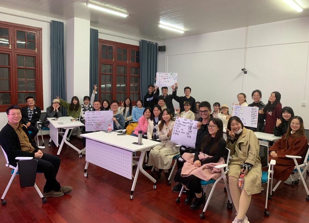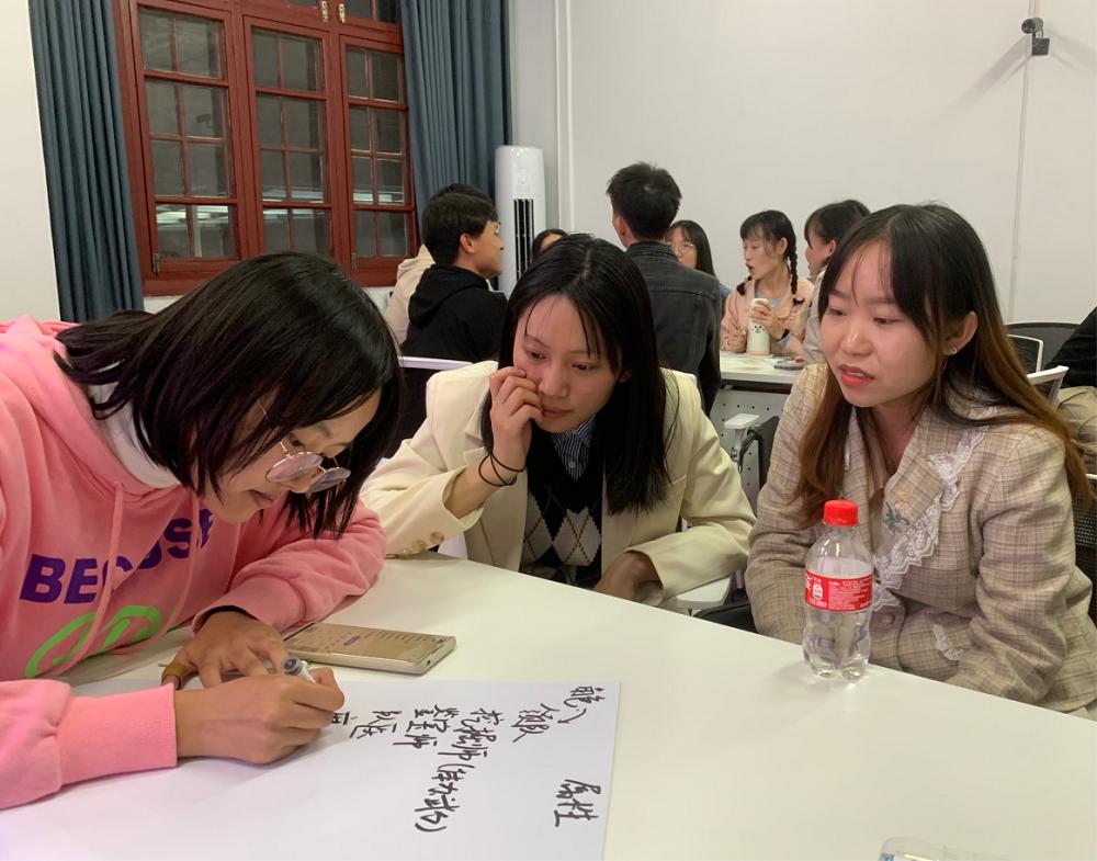 李老师首先通过“十个小问题”的热身活动迅速拉近同学们之间的距离,活动现场气氛十分热烈。接下来,以小组形式开展“寻宝逃生游戏”,游戏通过设置情景、放松冥想的诱导方式,模拟寻宝过程中的突发灾难,各小组在李老师的带领下进行角色设置,同时小组成员共同讨论逃生顺序。“寻宝逃生游戏”旨在通过团体内人际交互作用,促使个体在交往中认识自我、接纳自我、发现自身的特质和闪光点,学习新的态度与行为方式,不断调整生活状态,以更好地适应当下的学习、生活和未来的职位规划。