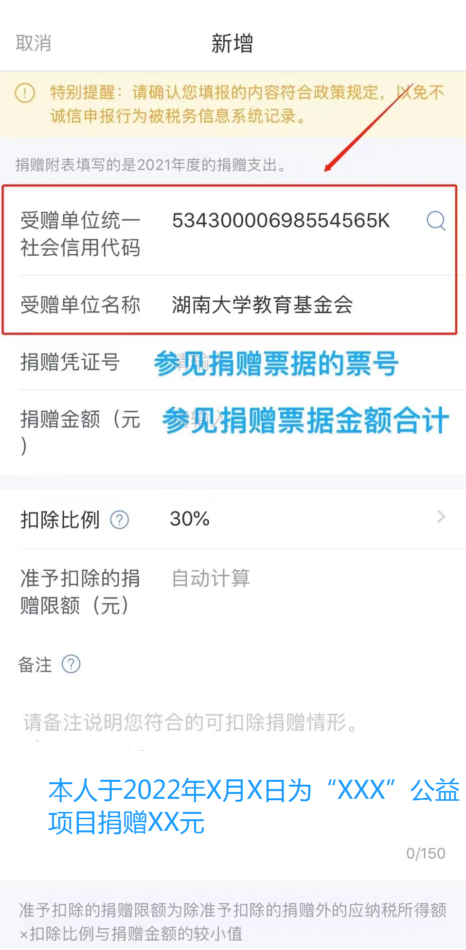 教育基金会”。“捐赠凭证号”和“捐赠金额”可以参见我们为您开具的捐赠票据,选择扣除比例(通常捐赠扣除比例为30%),并在备注中说明捐赠的年月和捐赠项目名称。